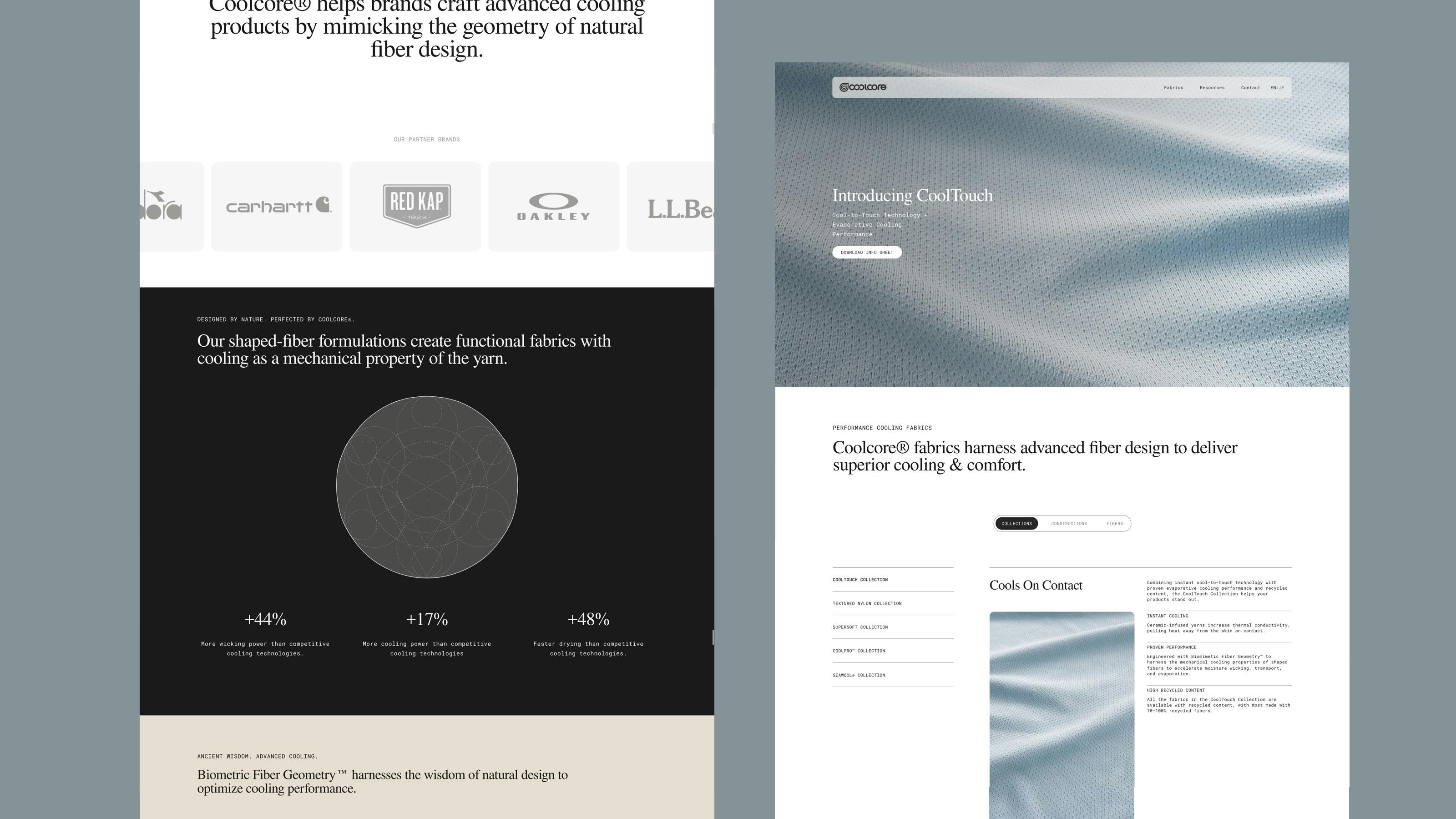 For Coolcore we made an ultra light, ultra slick, and multilingual website to showcase their repertoire of advanced cooling fabrics, fibers, and clothing.