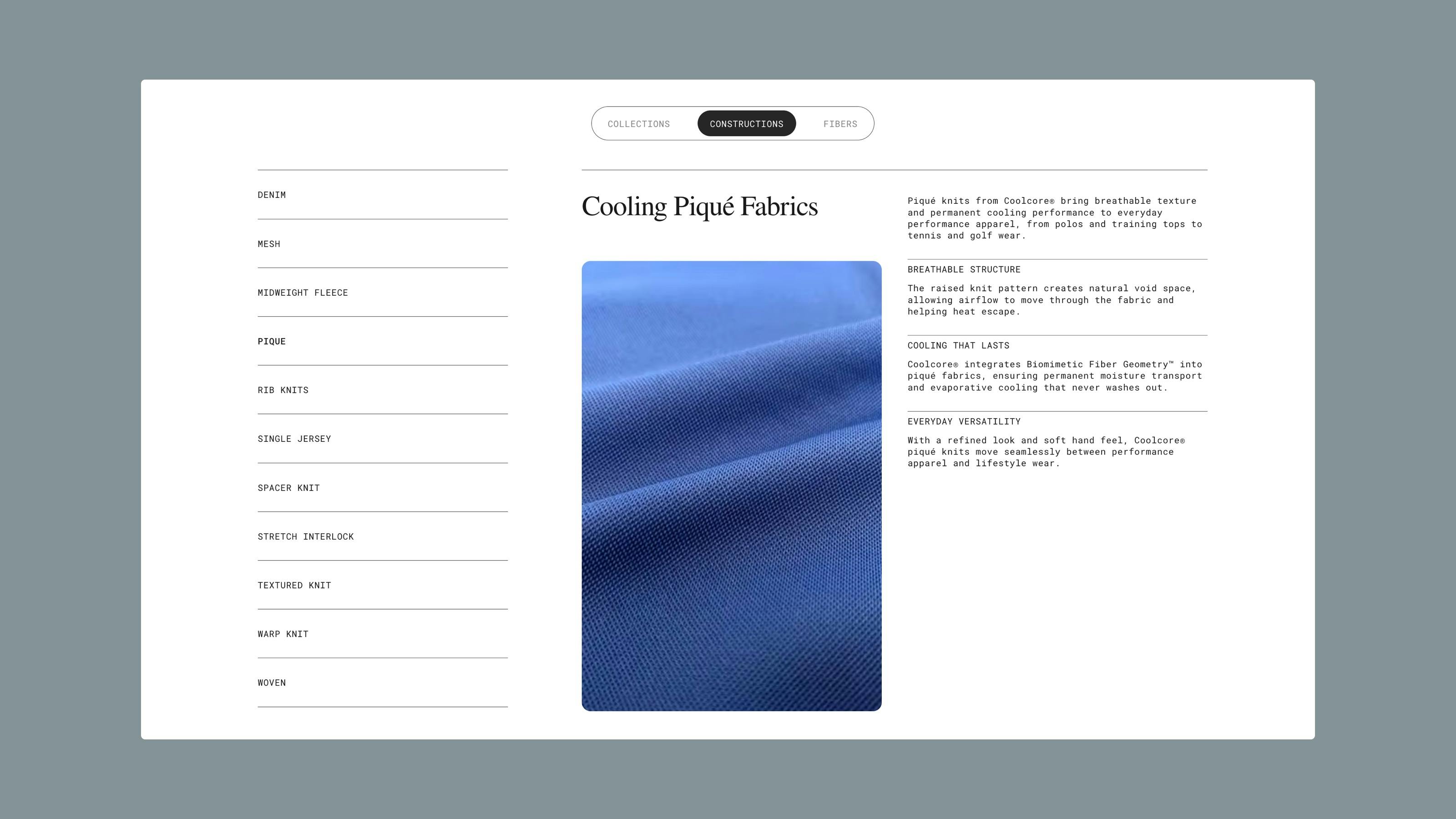 Using Next.js with a Prismic CMS was a no-brainer for this project. We created a customized library of designed modules to allow the Coolcore team to showcase their fabrics, constructions, and collections, alongside flexible, repeatable templates for all content types and resources, including case studies, tradeshows, articles and more.