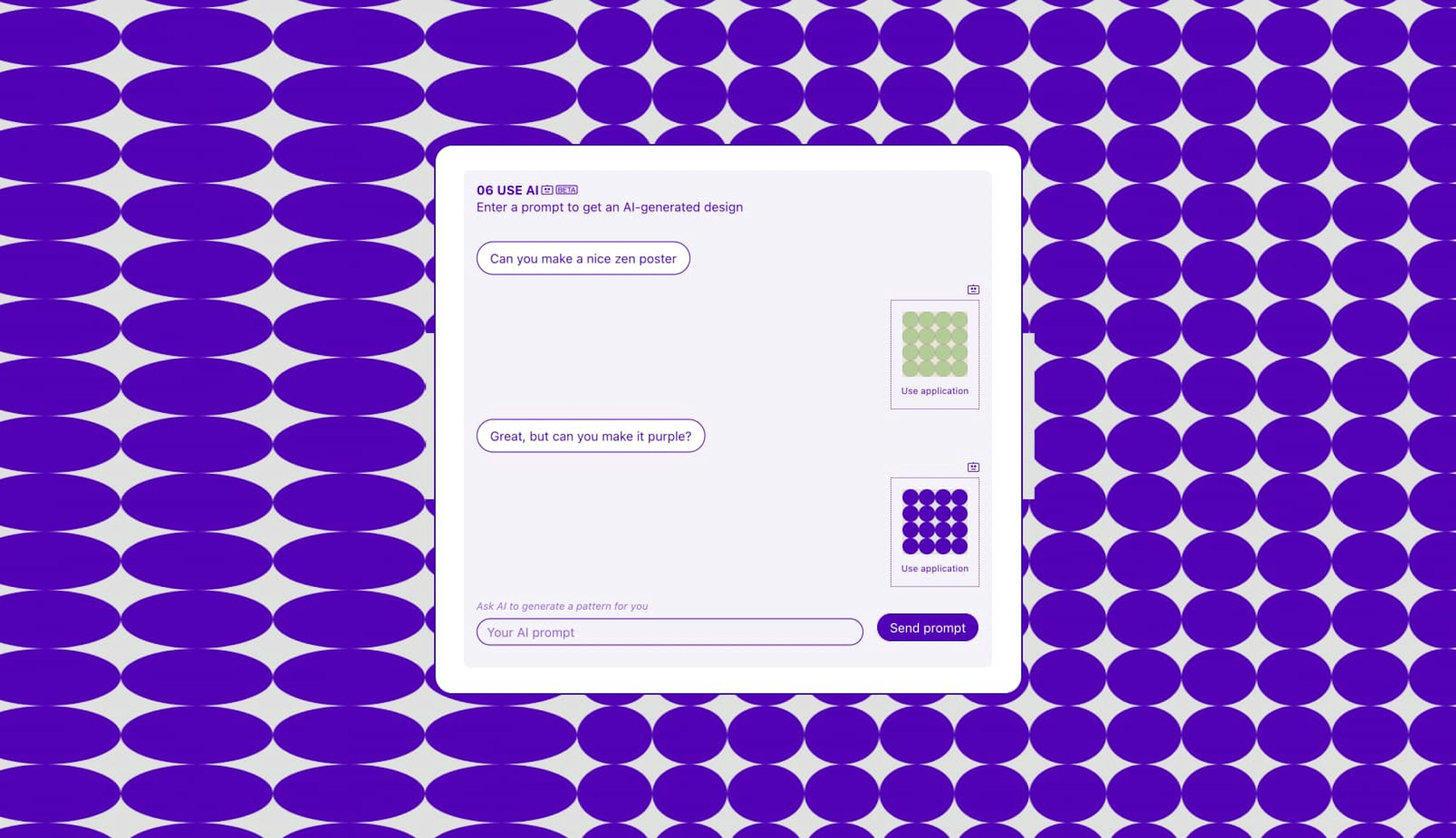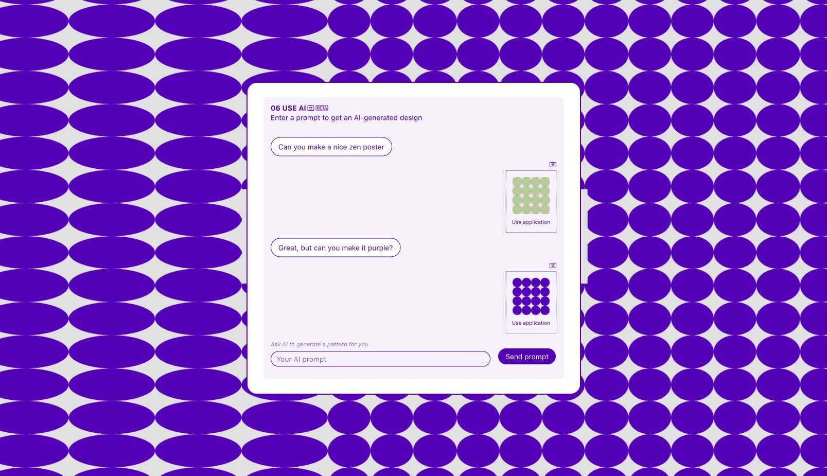 We thought this would be a great opportunity to experiment with using AI to generate new patterns based on a user’s request. As each pattern is represented by a simple javascript object, we would ask GPT-4 to generate us a new javascript object using the same variables but with different values.