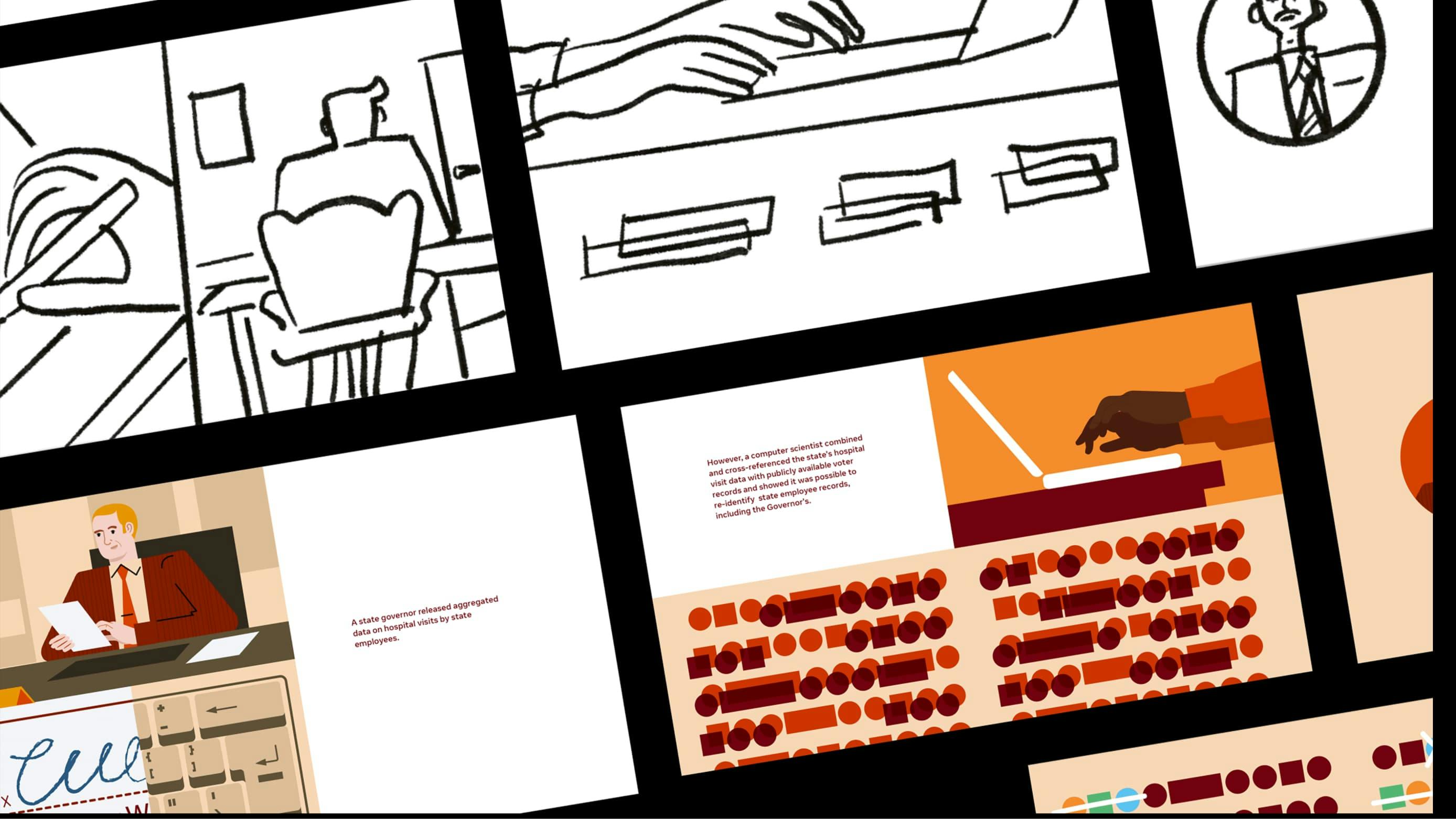 We worked closely with the Meta team to develop the PET explainers. In weekly workshops, we delved into the details of these technologies and then took a step back to see how we could explain it to non-technical audiences. The Meta PET team shared how they explained their work to friends and family, which uncovered powerful analogies and simplified language. Together, we iterated and refined storyboards and narratives until they were technically correct as well as compelling for an everyday reader.