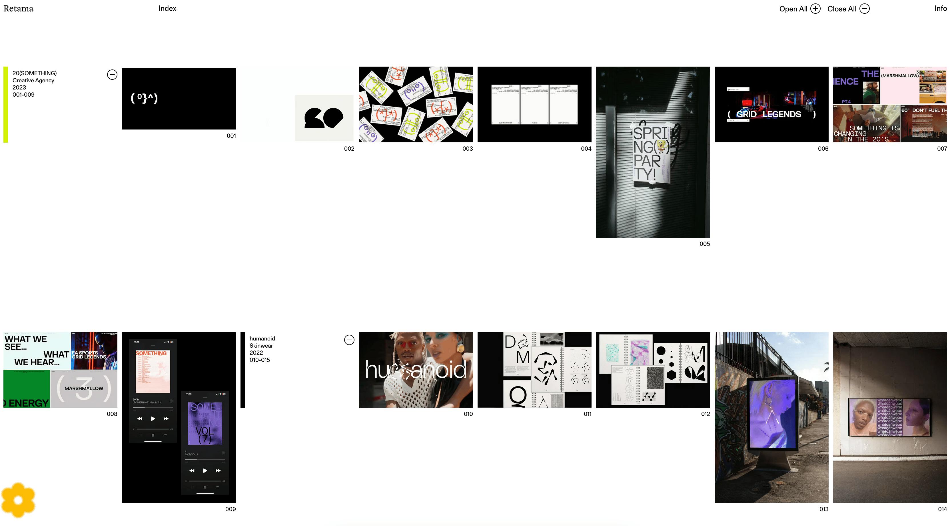 - The homepage’s freely expandable / retractable grid, thoughtful touches of colour and movement woven in