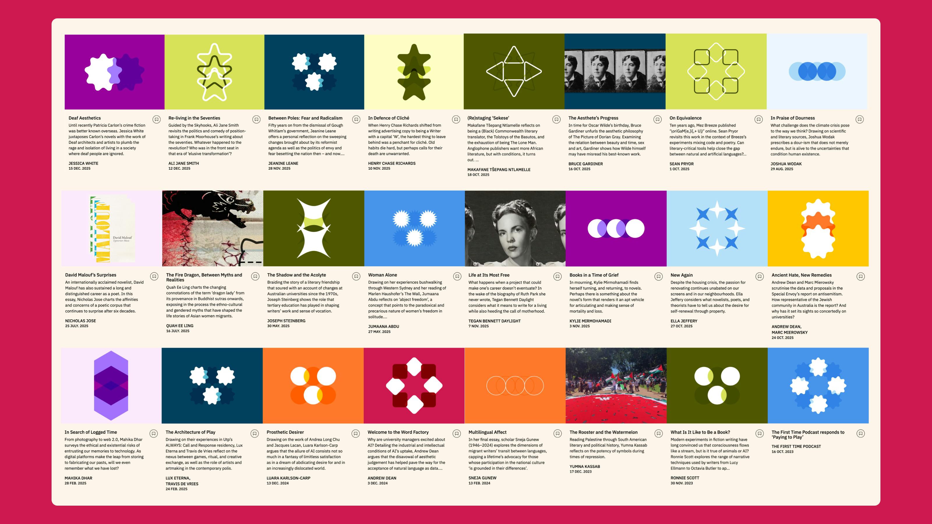 For the Sydney Review of Books we built a flexible branding tool to create thousands of unique, pattern-based images to accompany their library of essays, reviews, articles, and interviews.